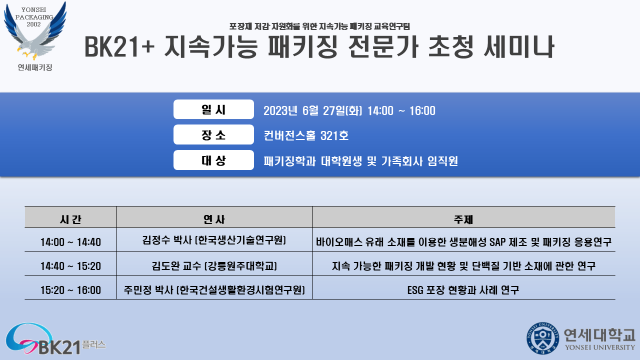 - [전문가 초청 세미나] 2023-1 BK21+ 지속가능 패키징 전문가 초청 세미나 일정 공지