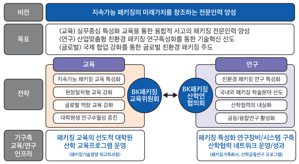 선도적인 패키징 전문교육프로그램, 산학협력 네트워크 등의 기구축 교육 및 연구 인프라, 글로벌 벤치마킹, 외부환경 분석 등을 기반으로 교육, 연구, 글로벌 분야의 목표를 수립