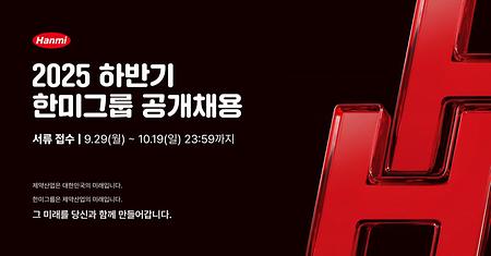 - 공고명 2025년 하반기 한미그룹 공개채용 공고접수기간 2025. 9. 29(월) ~ 2025. 10. 19(일) 23:59 까지 공고 URLhttps://hanmi.recruiter.co.kr/career/apply